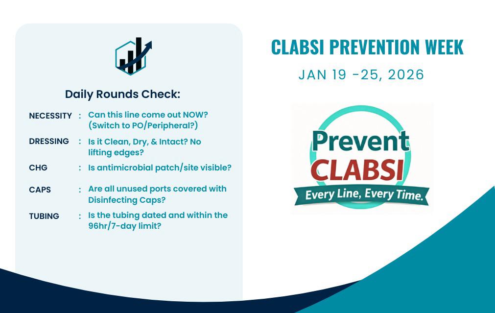 CLABSI Prevention Week 2026 campaign aims to a enhance the national profile on the importance of CLABSI reduction strategy (CRRS) to reinforce best practices and provide the necessary boost to reach the target CLABSI national rate. It focuses on raising awareness about the importance of preventing central line-associated bloodstream infections (CLABSI) in healthcare settings. The campaign encourages healthcare professionals and healthcare facilities to unite their efforts to reduce the incidence of these preventable infections, which pose serious risks to patient safety.